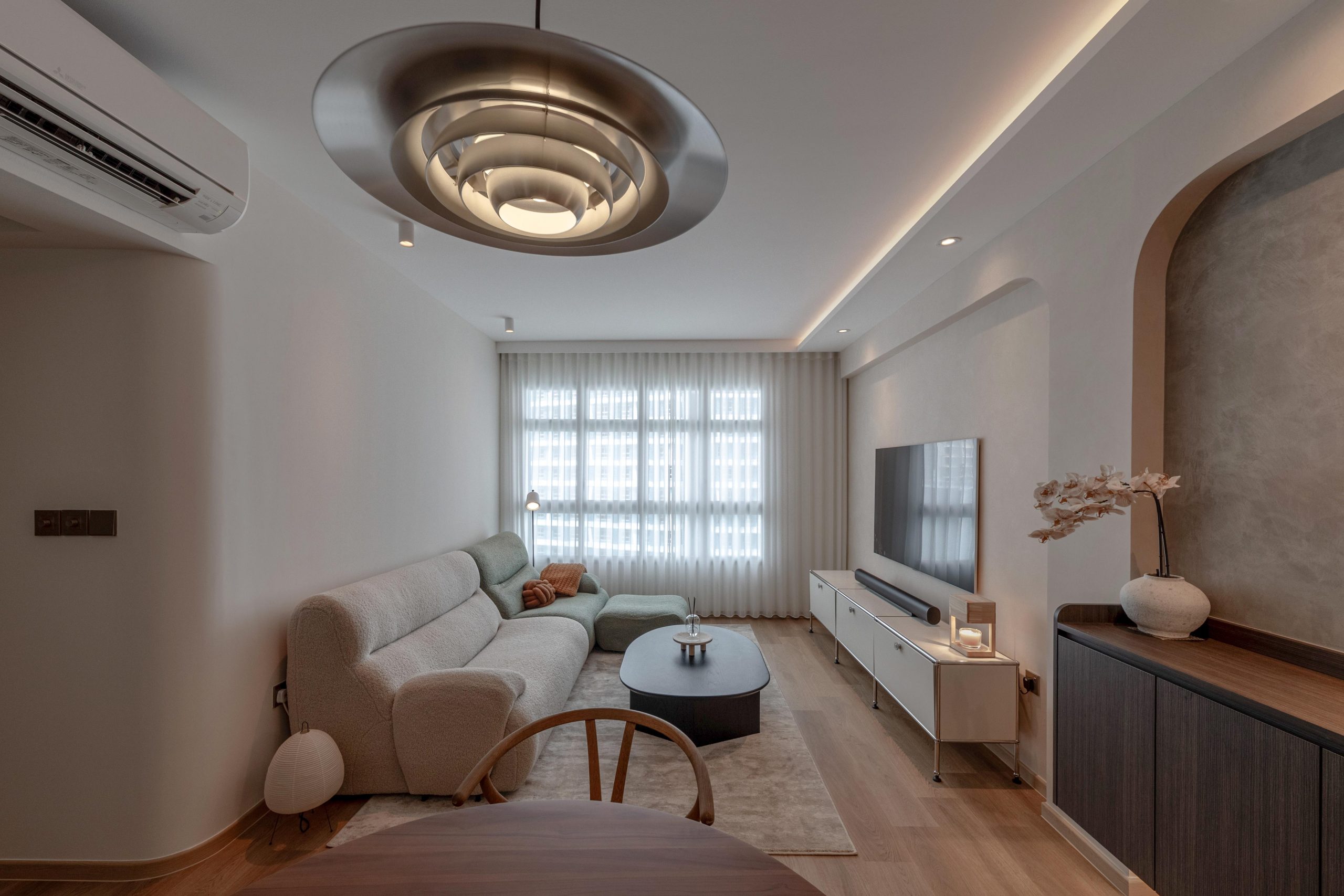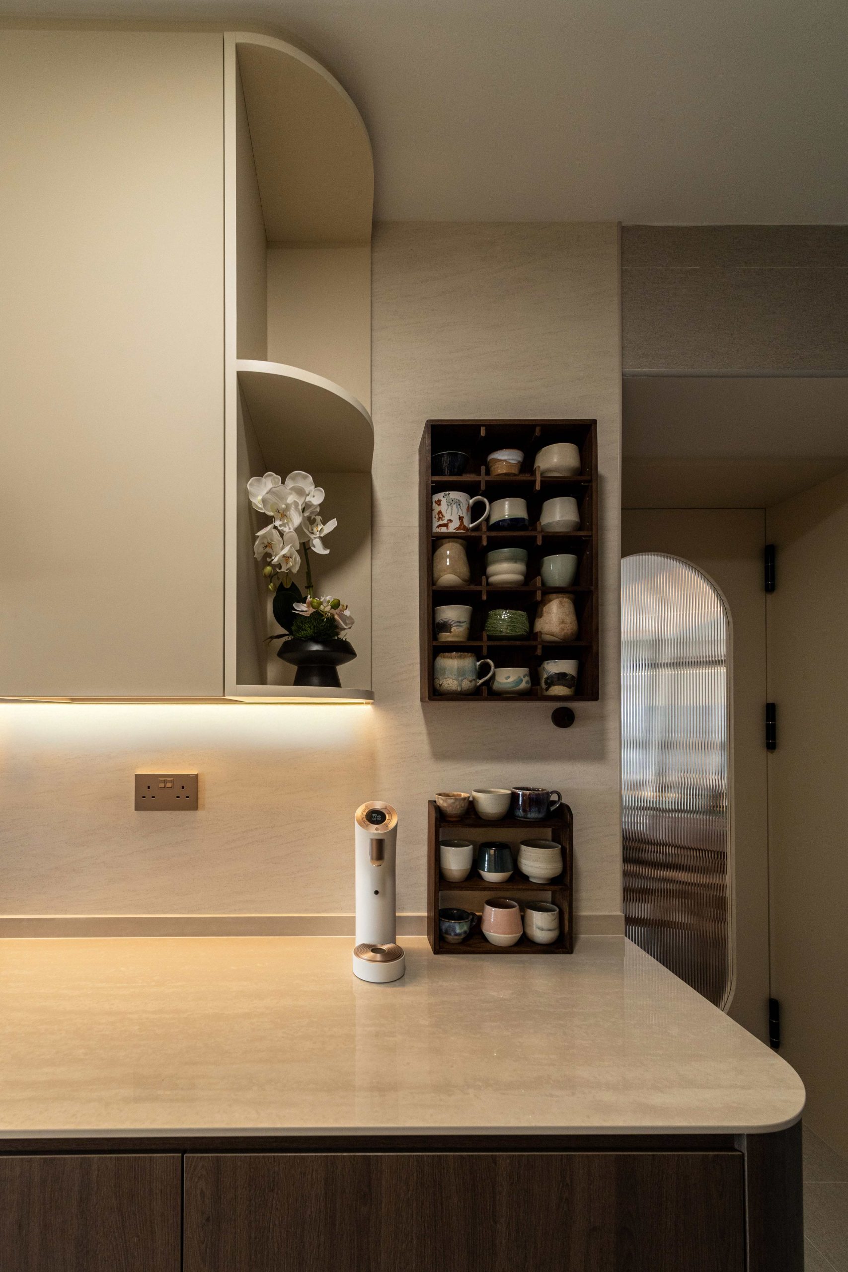 The living area is anchored by a custom arched alcove, a strategic Small Space Living Solution that transforms a functional storage nook into a lighted gallery. By utilizing rounded corners on the cabinetry and false ceilings, we soften the room’s visual boundaries, creating a fluid transition that makes the interior feel significantly more expansive.