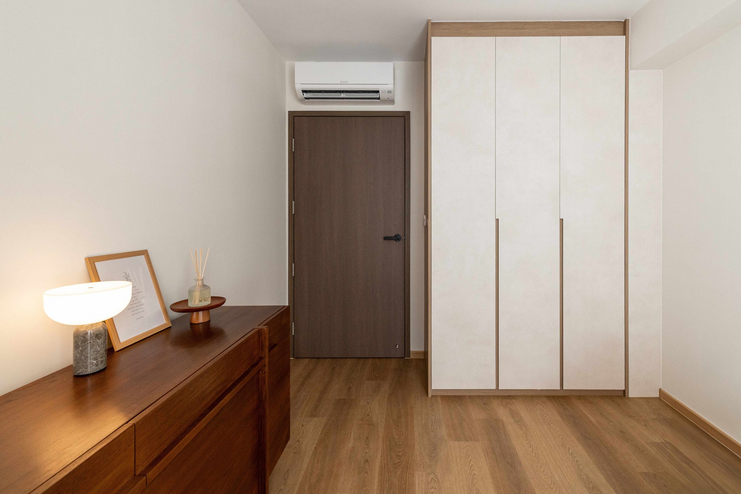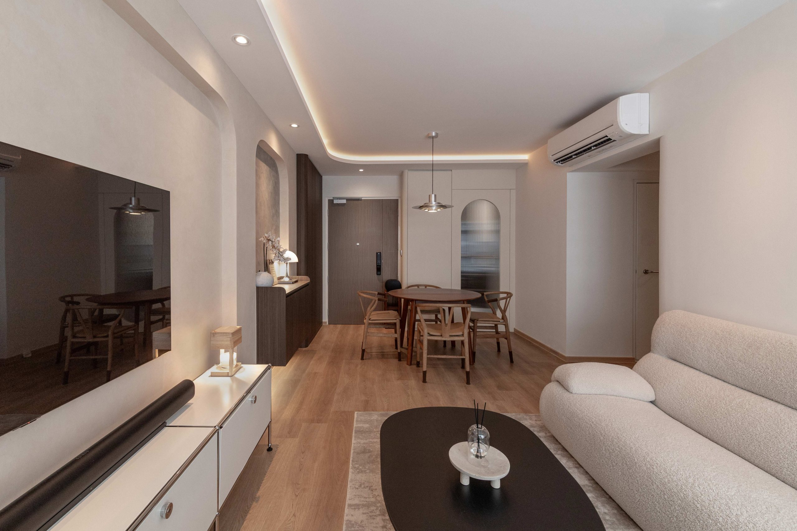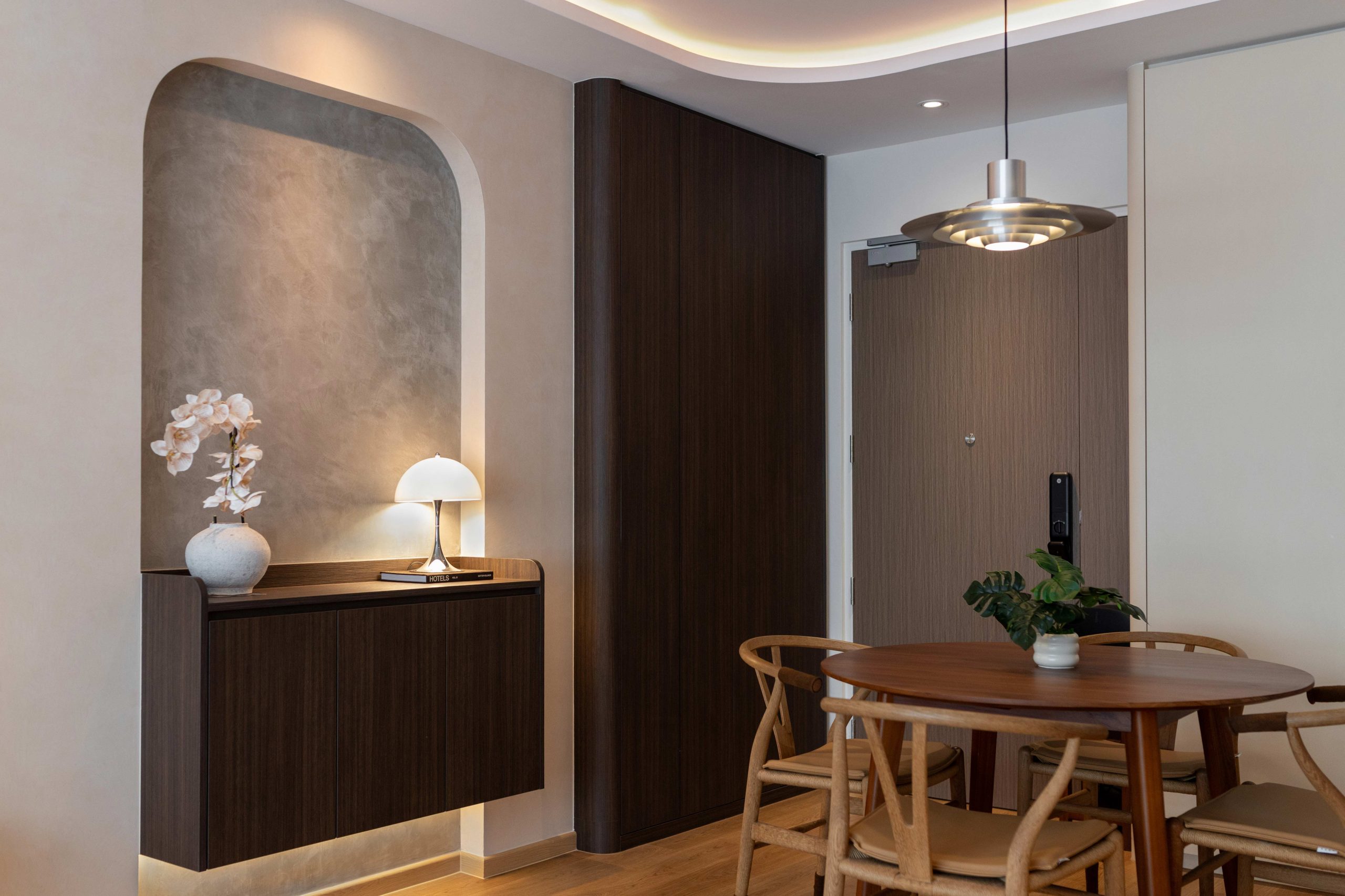 The dining area features a curved timber-clad partition that conceals structural columns while housing the entryway storage. This seamless integration ensures that the Material Logic remains consistent from the entrance to the private quarters.