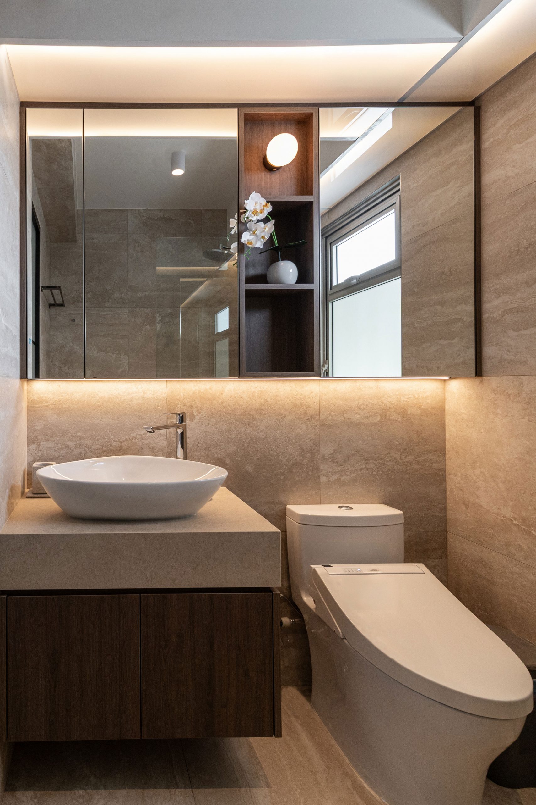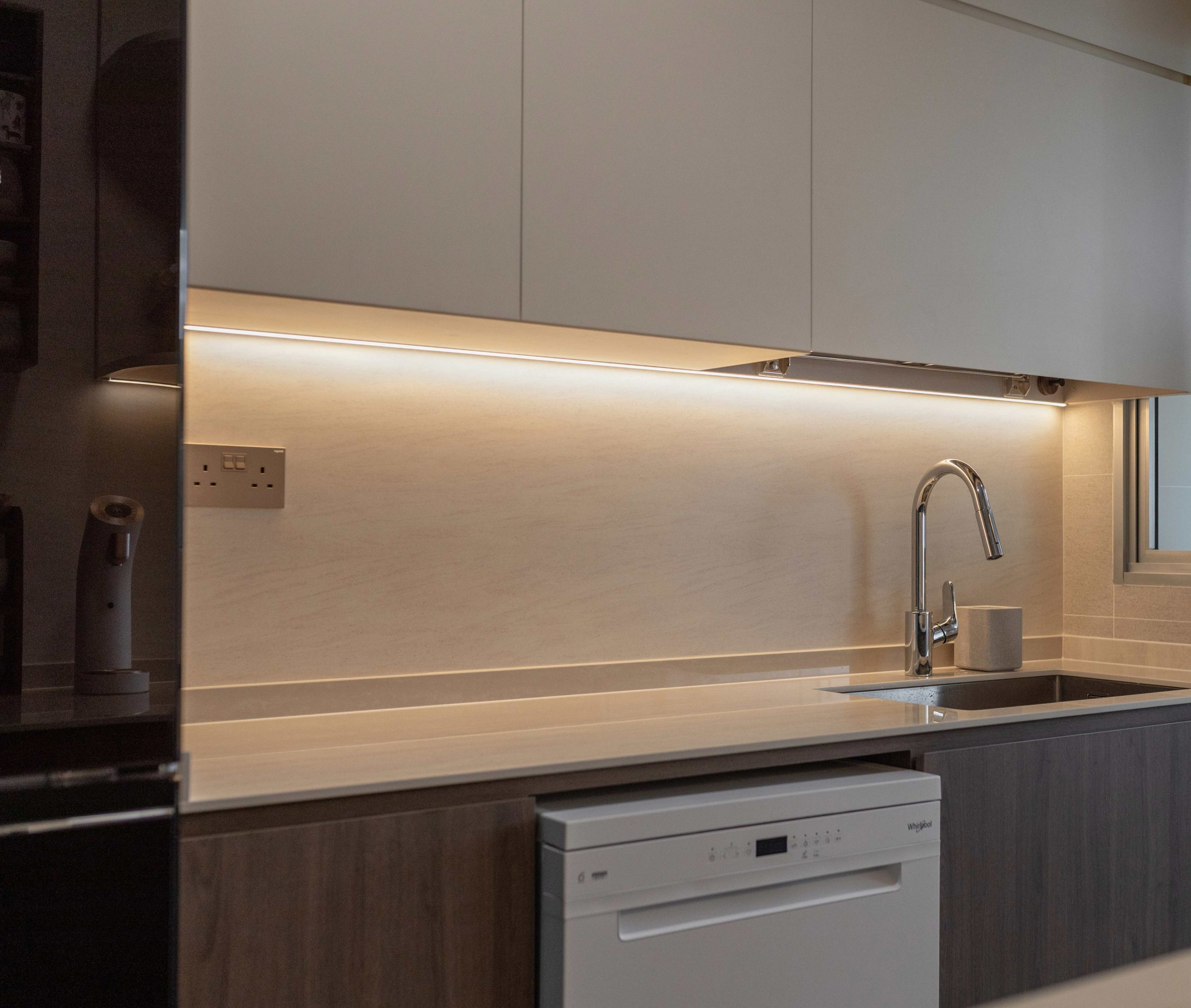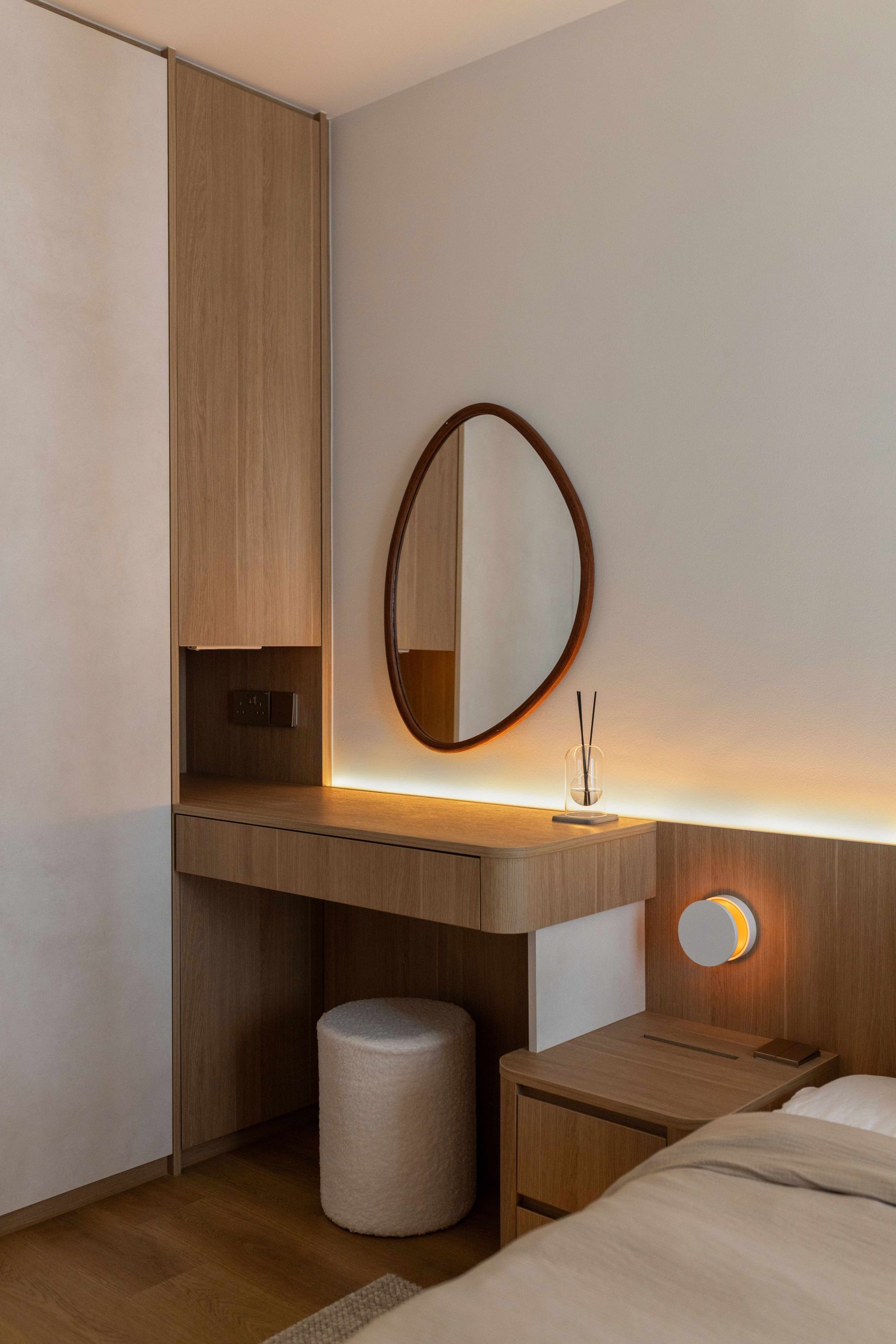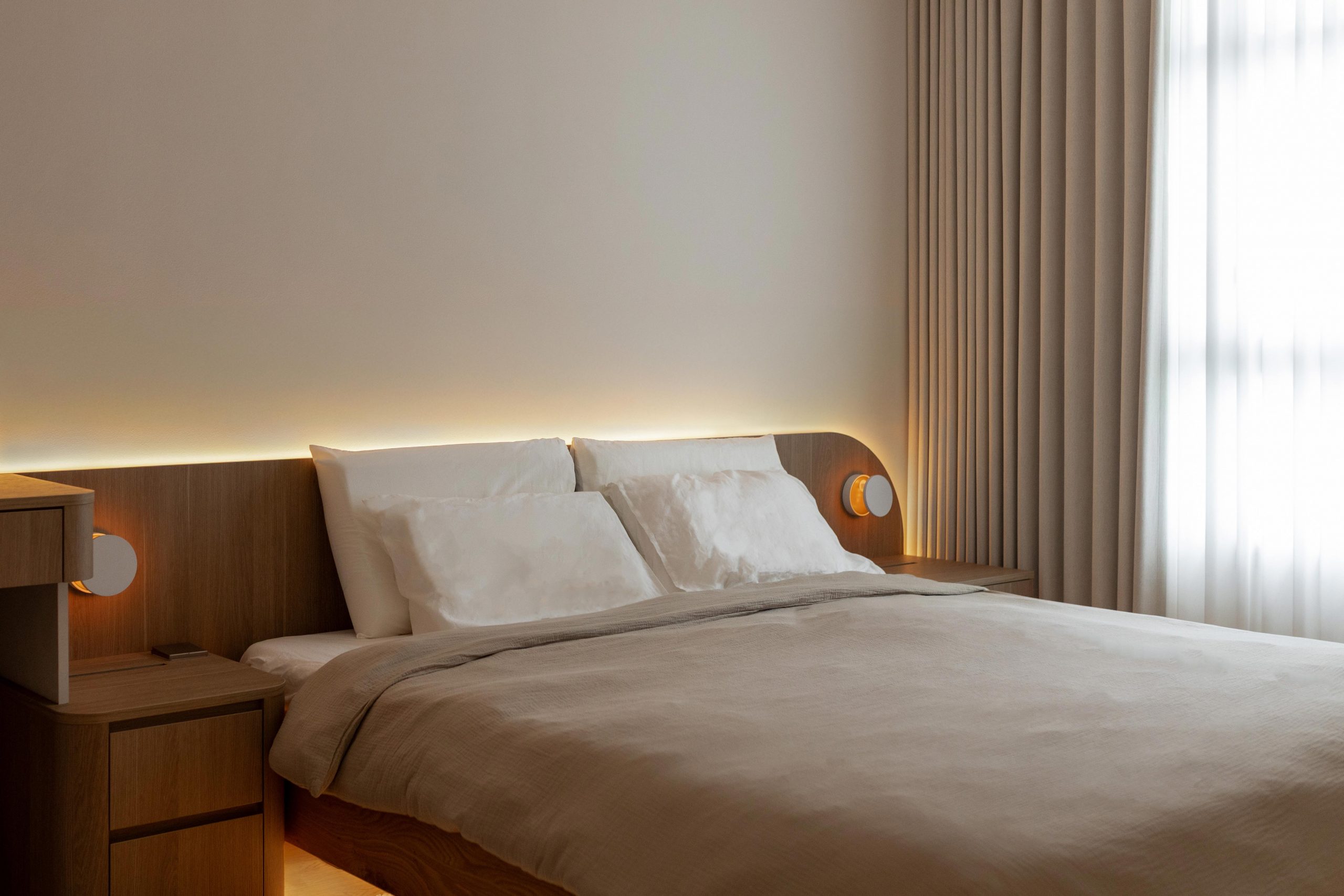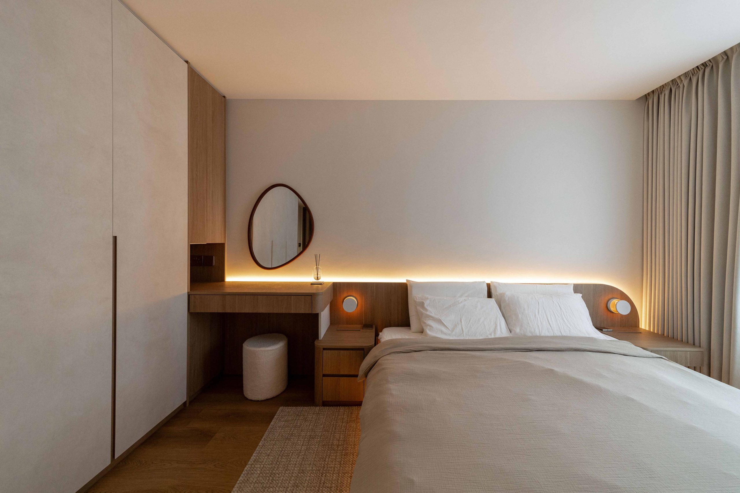 In the Master Bedroom, we applied a bespoke headboard with integrated cove lighting. This eliminates the need for bulky bedside lamps, keeping surfaces clean and maximizing the floor area.